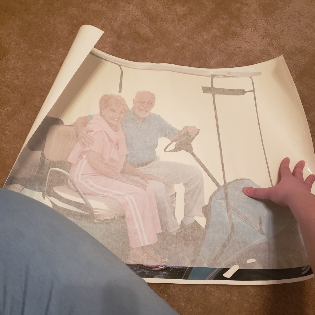 A giant wall decal of two seniors I don’t know riding a golf cart…