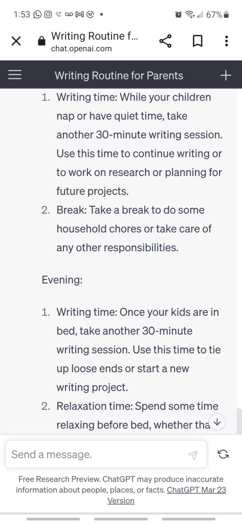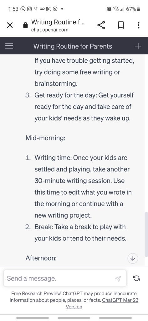 Basically what Chat GPT came back with was a writing routine where you do thirty minute sessions throughout the day in between caring for your kids. One before they wake up, a mid morning session while they “play quietly”, an afternoon session while they nap or have “quiet time” and an evening session after your kids go to bed.